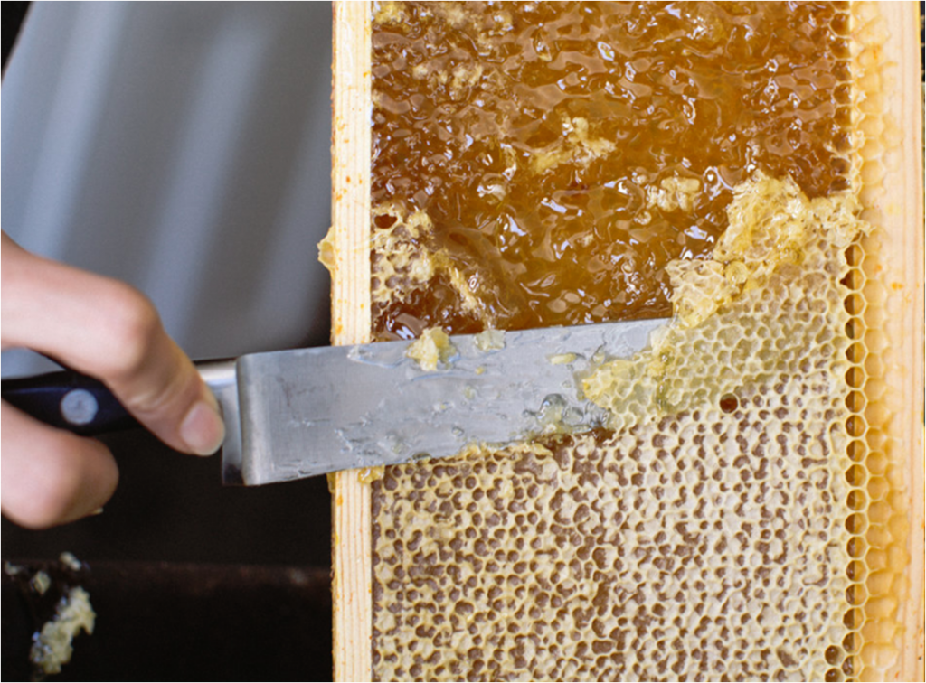 Traditional honey extraction process, which hasn't changed much in over a century, involves removing the wax cappings to reveal the honey beneath. Then, we place the frames in a centrifuge and spin for about 10 minutes. This method preserves the honey's natural values.