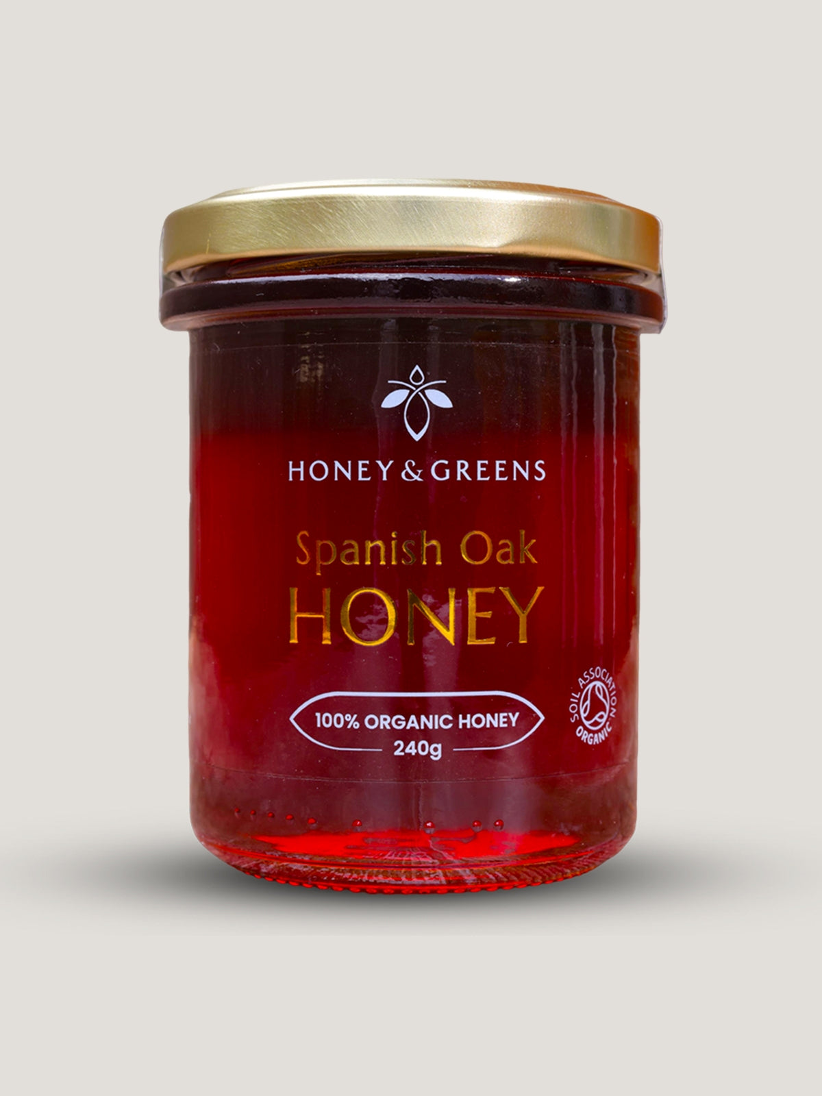 A premium selection derived from the acorns of Spanish oak trees. During the summer and autumn months, these acorns release a sweet nectar, expertly collected by bees to craft this very dark, less-sweet and robust honey.