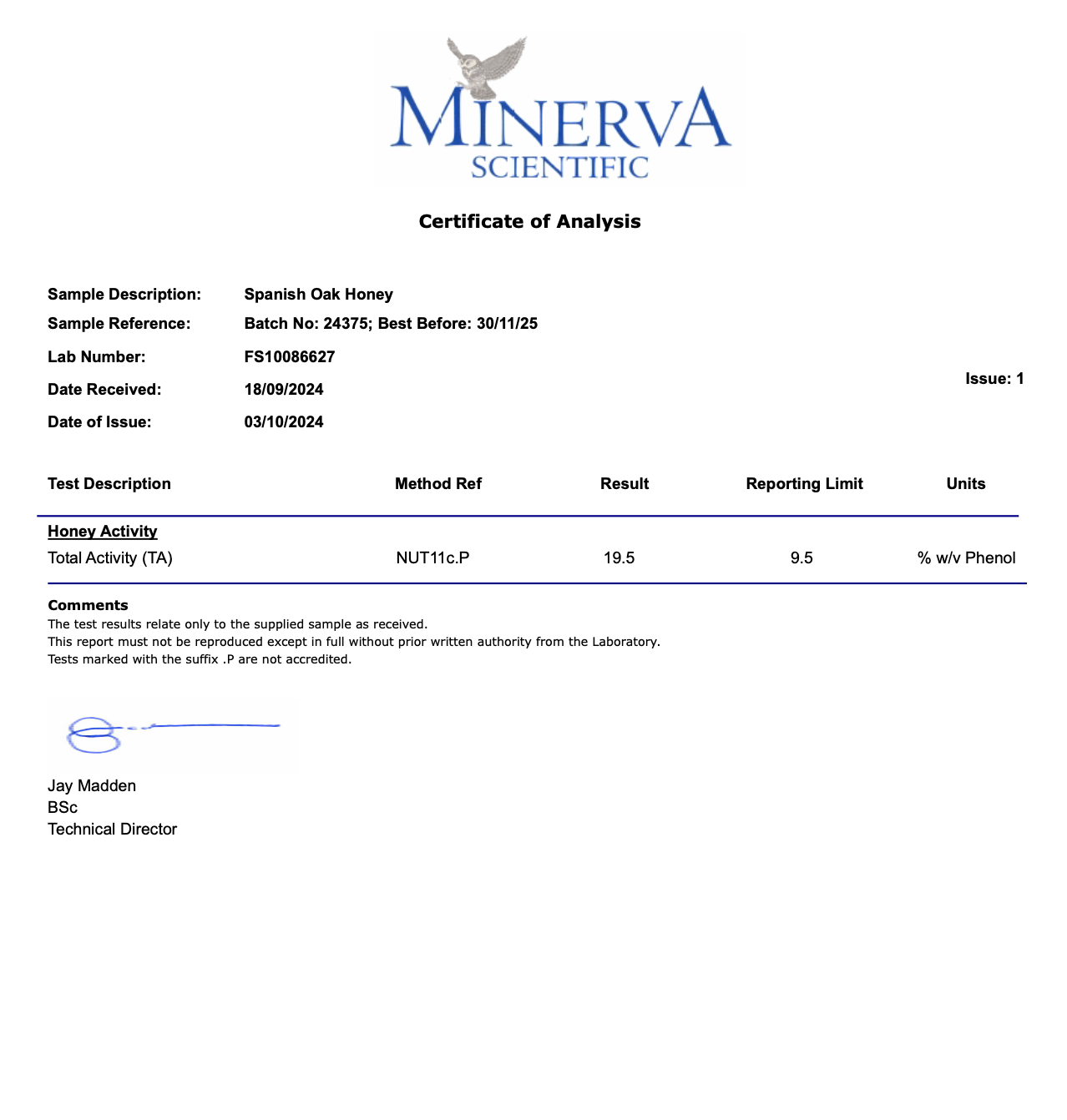 This honey has been tested and certified by Minerva Scientific to have a TA 15+ (Total Activity) rating, which refers to its beneficial, antimicrobial (bacteria-fighting) properties. The higher the TA, the greater the potential health benefits.